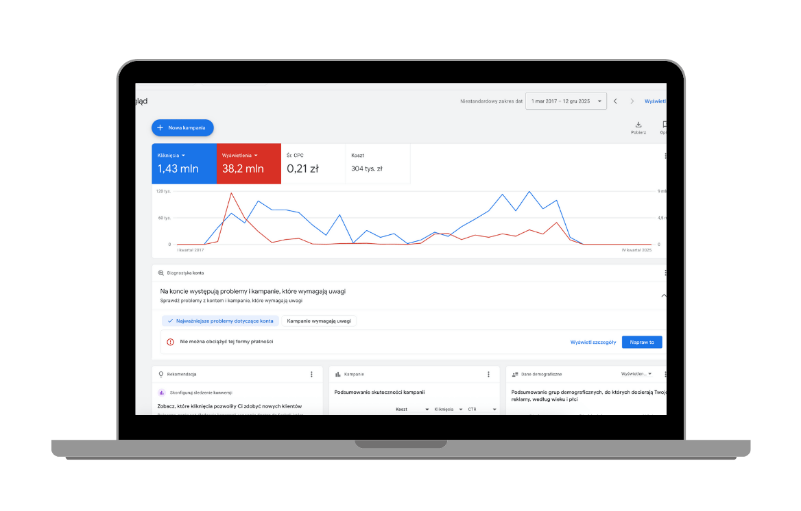W przypadku oferty dla firm (B2B), to właśnie Google Ads stało się naszym głównym i najskuteczniejszym kanałem pozyskiwania leadów. Zamiast szukać klienta po omacku, przejmowaliśmy go w momencie, gdy decydent wpisywał w wyszukiwarkę konkretne potrzeby: „sala konferencyjna na 200 osób”, „organizacja eventu firmowego” czy „wynajem sali kinowej”.